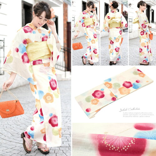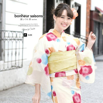 浴衣 セット レディース レトロ 浴衣セット 大人 3点セット 白系 ホワイト クリーム カラフル 黄色 ぼかし 梅 花 麻の葉 ラメ 綿 紅梅織 兵児帯 女性 ボヌールセゾン フリー 【送料無料】【あす楽対応】【浴衣 セット】