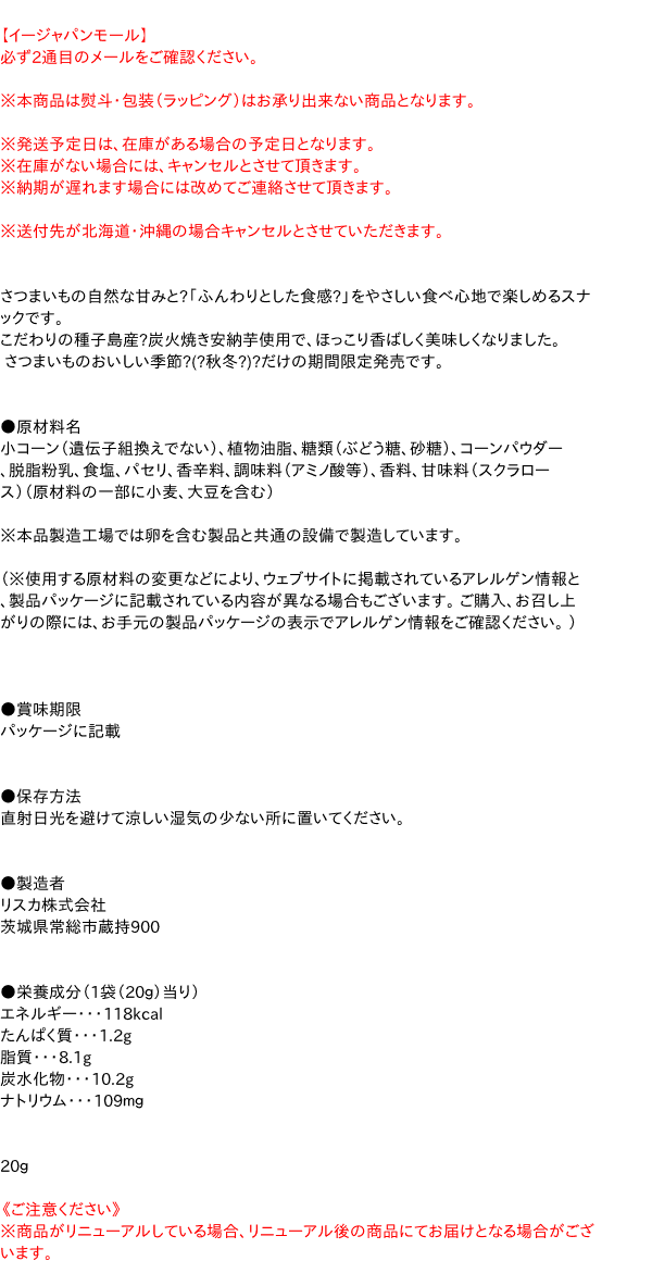 ●製造者 リスカ株式会社 茨城県常総市蔵持900 ●栄養成分(1袋(20g)当り) エネルギー・・・118kcal たんぱく質・・・1.2g 脂質・・・8.1g 炭水化物・・・10.2g ナトリウム・・・109mg 20g【広告文責】株式会社イージャパンアンドカンパニーズ 072-875-6666《ご注意ください》 ※商品がリニューアルしている場合、リニューアル後の商品にてお届けとなる場合がございます。