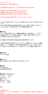●原材料名 小コーン(遺伝子組換えでない)、植物油脂、糖類(ぶどう糖、砂糖)、コーンパウダー、脱脂粉乳、食塩、パセリ、香辛料、調味料(アミノ酸等)、香料、甘味料(スクラロース)(原材料の一部に小麦、大豆を含む) ※本品製造工場では卵を含む製品と共通の設備で製造しています。