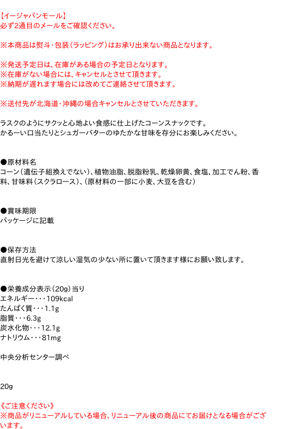 ●原材料名 コーン(遺伝子組換えでない)、植物油脂、脱脂粉乳、乾燥卵黄、食塩、加工でん粉、香料、甘味料(スクラロース)、(原材料の一部に小麦、大豆を含む) ●賞味期限 パッケージに記載 ●保存方法 直射日光を避けて涼しい湿気の少ない所に置いて頂きます様にお願い致します。