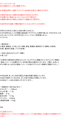 〜栄養成分(1袋(26g)当り)〜 エネルギー・・・128kcal たんぱく質・・・1.7g 脂質・・・5.7g 炭水化物・・・17.5g ナトリウム・・・244mg (食塩相当量・・・0.6g) 26g【広告文責】株式会社イージャパンアンドカンパニーズ 072-875-6666《ご注意ください》 ※商品がリニューアルしている場合、リニューアル後の商品にてお届けとなる場合がございます。
