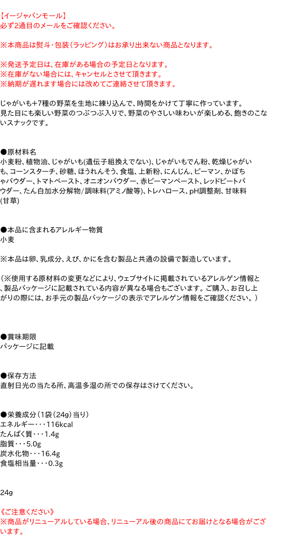 〜原材料名〜 小麦粉、植物油、じゃがいも(遺伝子組換えでない)(男爵いも100%使用)、じゃがいもでん粉、乾燥じゃがいも、コーンスターチ、砂糖、ほうれんそう、食塩、上新粉、ピーマン、トマトペースト、オニオンパウダー、にんじん、赤ピーマンペースト、かぼちゃパウダー、レッドビートパウダー、調味料(アミノ酸等)、トレハロース、pH調整剤、甘味料(甘草) *本品は卵、乳、えび、かにを含む製品と共通の設備で製造しています。
